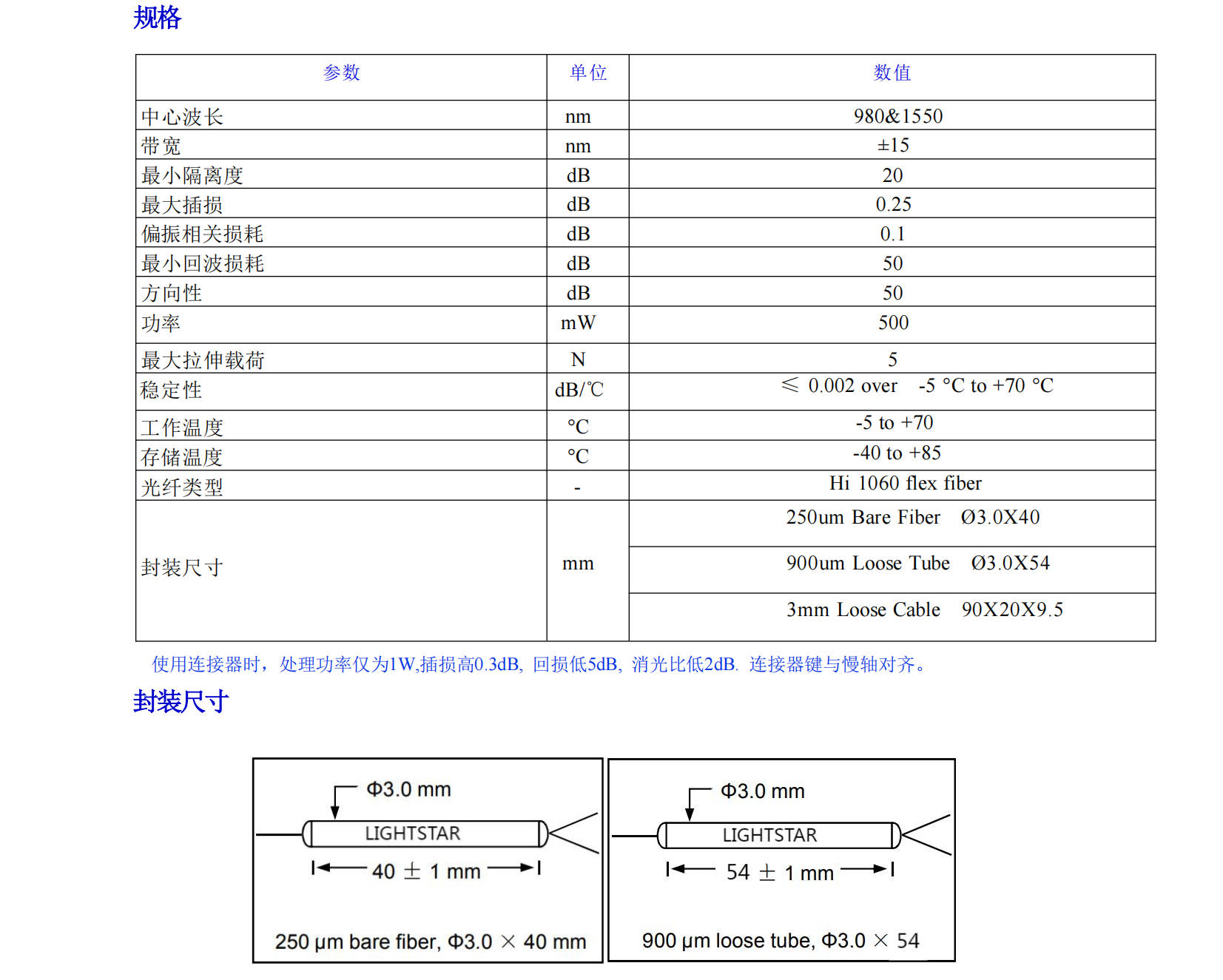 980-1550nm 单模拉锥波分复用器 3x54mm 500mW